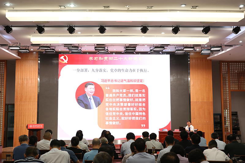 培训班还邀请校关工委常务副主任顾建国教授作《学习贯彻党的二十大党章》专题报告。他从党章的内涵和基本特征、中国共产党章程的诞生及其完善、党的二十大党章的主要内容、如何学习和践行党章等方面作专题辅导报告。